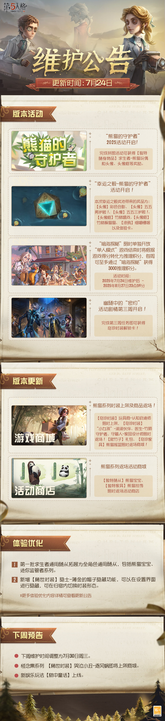 #第五人格维护公告# 2025年7月24日维护公告划重点版本来啦!第人 熊猫系列【奇珍时装】玩具商-认知启迪师即将上架商城,格月金铲铲科技外挂最新网站往期熊猫系列时装也将同步返场~ -->